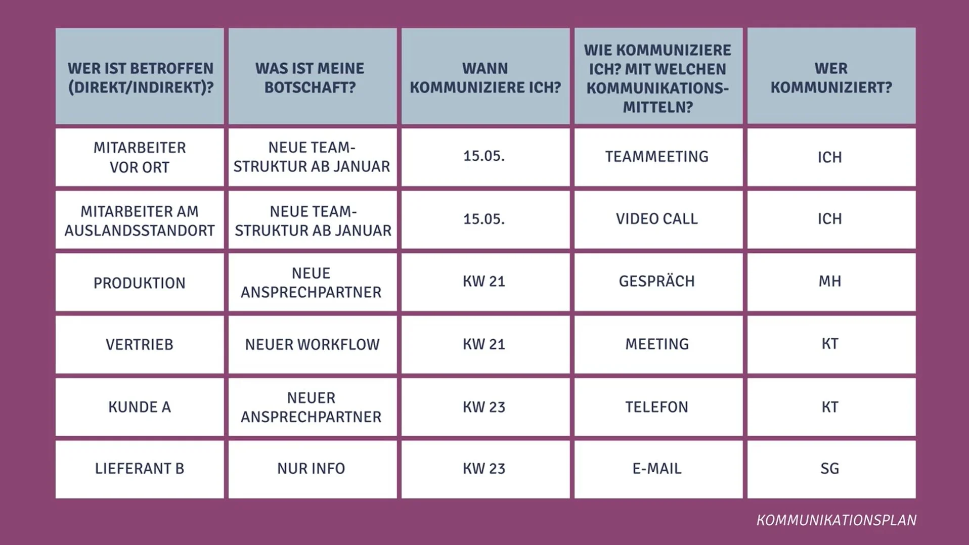 - Die Kommunikation mit allen Beteiligten ist eine zentrale und kritische Komponente jedes Veränderungsprojekts. Planen Sie dementsprechend viel Zeit dafür ein.
